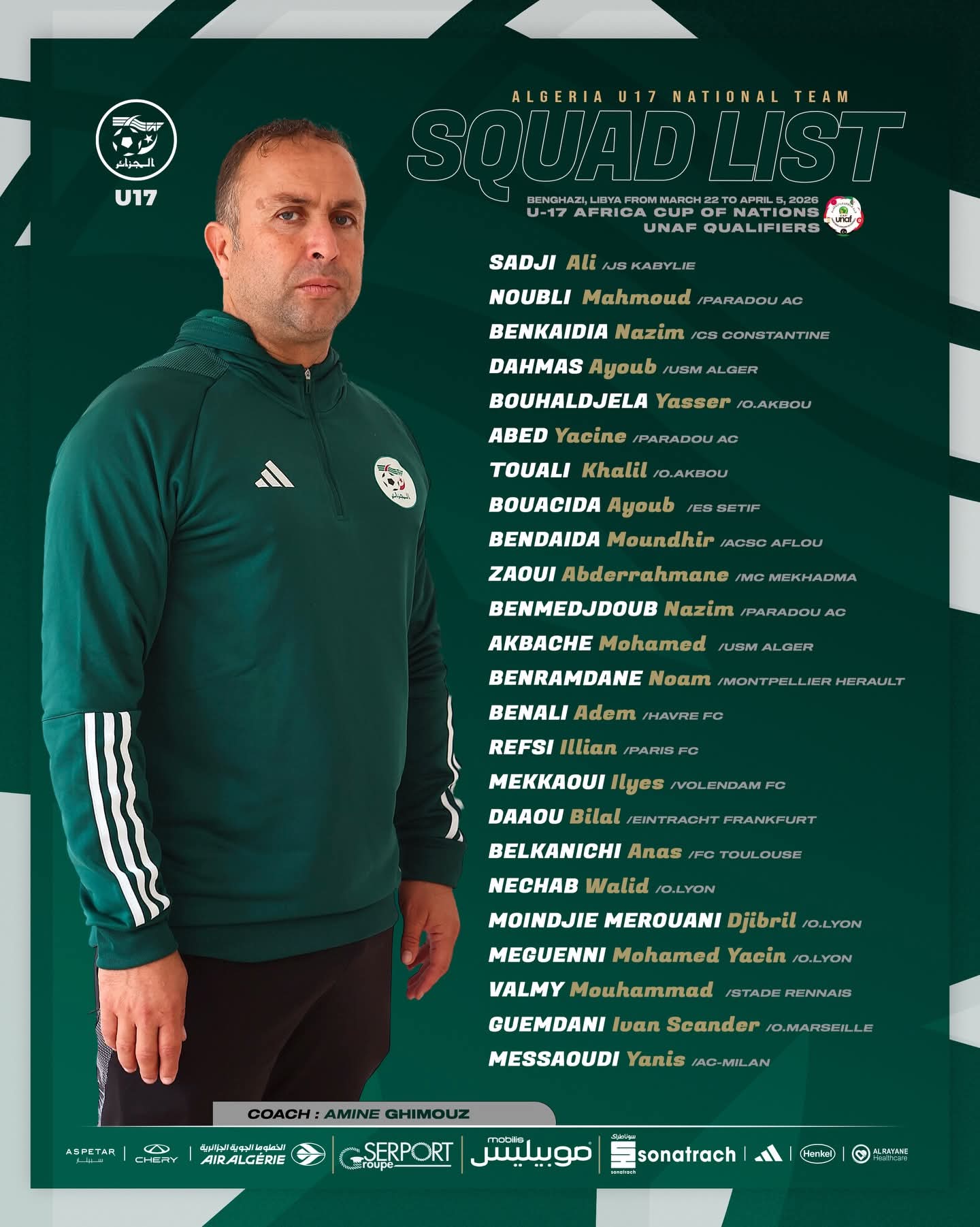 Le sélectionneur de l’équipe nationale de football des moins de 17 ans (U17), Amine Ghimouz, a retenu 24 joueurs en prévision de sa participation au tournoi de l’Union Nord-Africaine de Football (UNAF), prévu du 22 mars au 5 avril en Libye, qualificatif à la prochaine Coupe d’Afrique des nations CAN-2026 de la catégorie, a indiqué la Fédération algérienne (FAF) sur son site officiel.